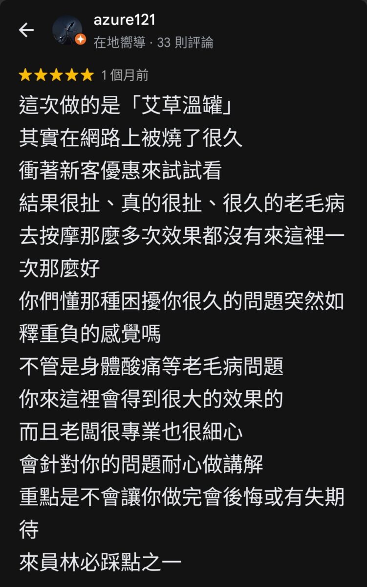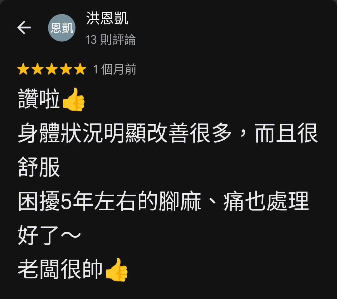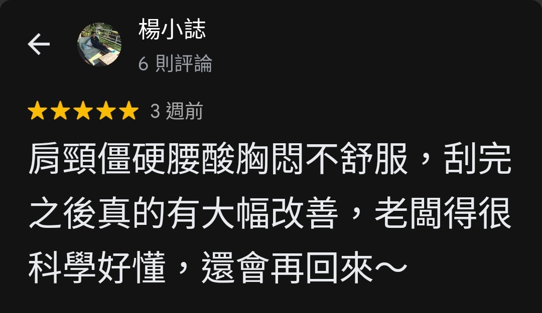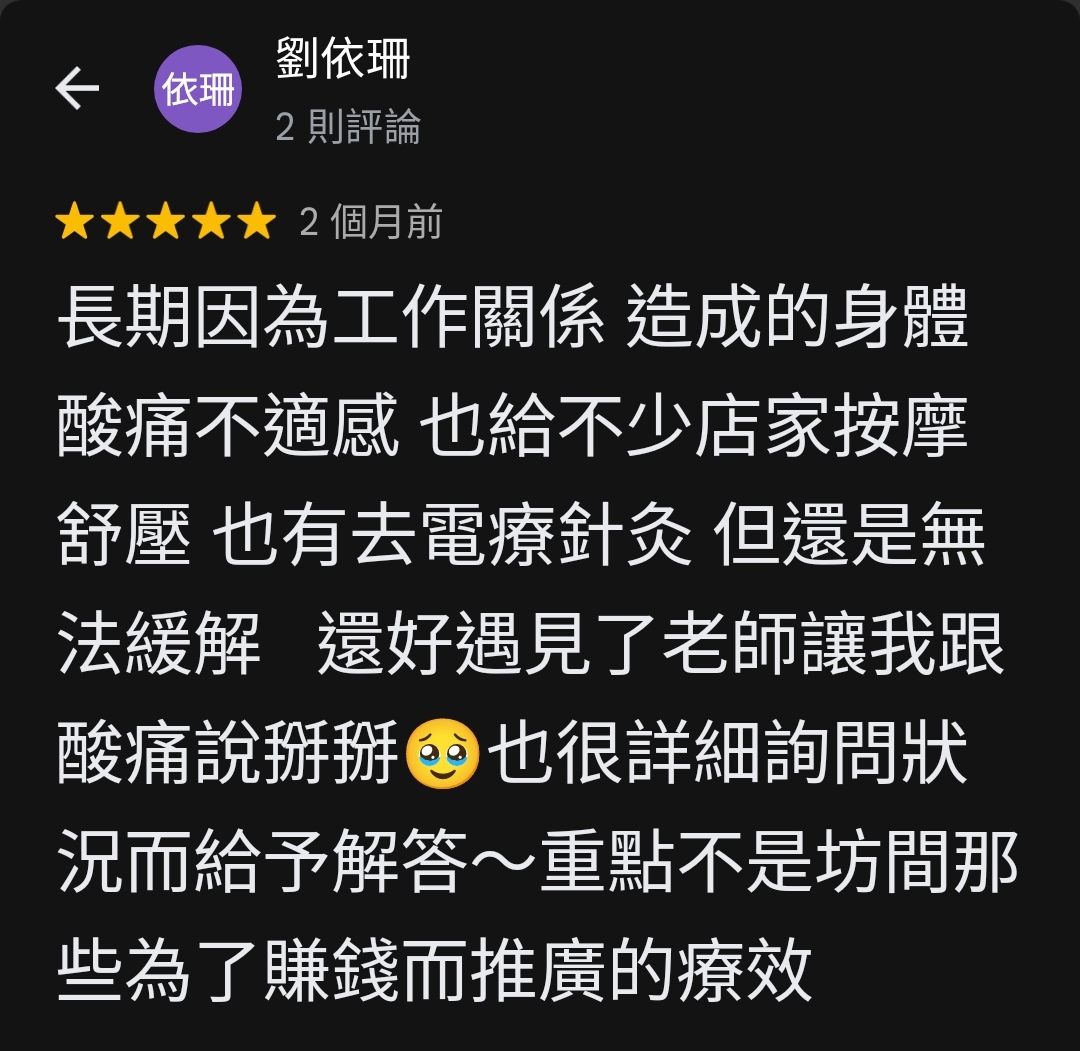 本店有許多客人,在嘗試上述各種方法後,仍無法解決自己長期的緊繃疲勞,來本店服務後便獲得改善。如果您有肩頸緊繃、各種痠疼,請您不要錯過,給自己一個機會嘗試,改善長期問題,找回您健康的身體。