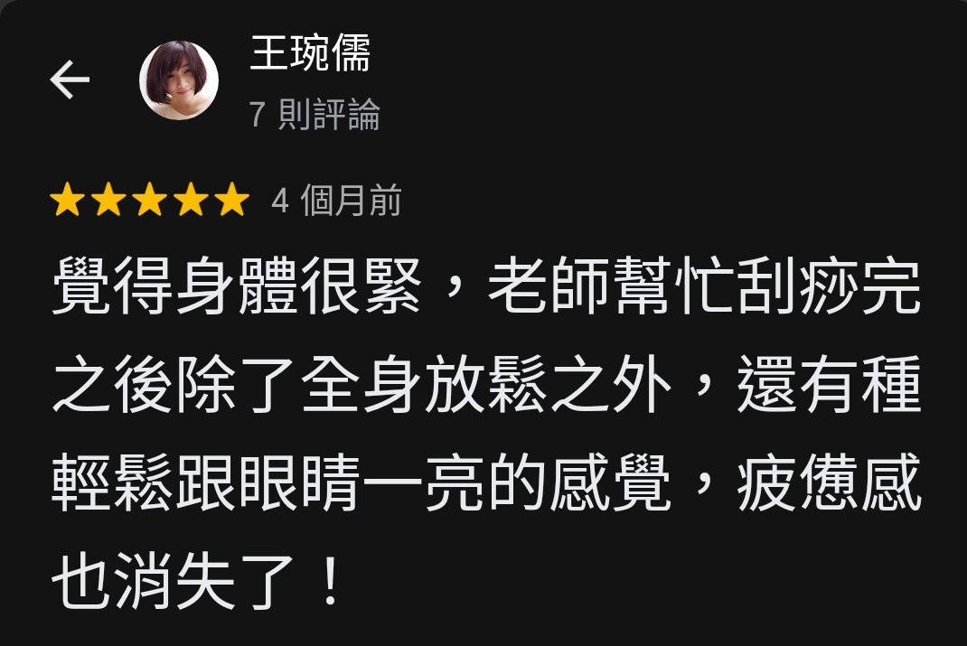 刮痧後解決的客人的後背疼痛,同時發現眼壓高不舒服,除了用眼過度,更大的問題是工作姿勢導致頭頸部肌肉緊繃。當下沒有處理眼睛,直接放鬆頭頸肌肉後,客人眼睛就直接亮起來了!
