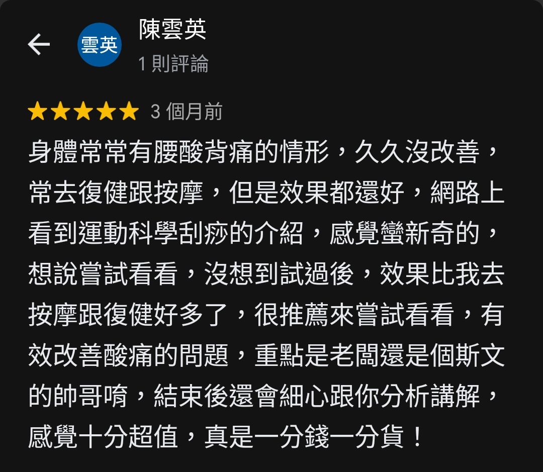 這位客人身體緊繃多年,復健拉腰、電療、針灸都只能暫時舒緩。透過刮痧放鬆深層肌肉搭配姿勢調整,改善了長期痠脹。