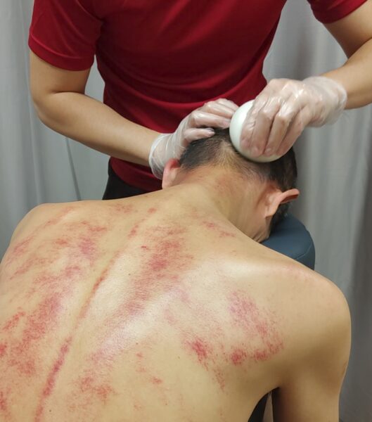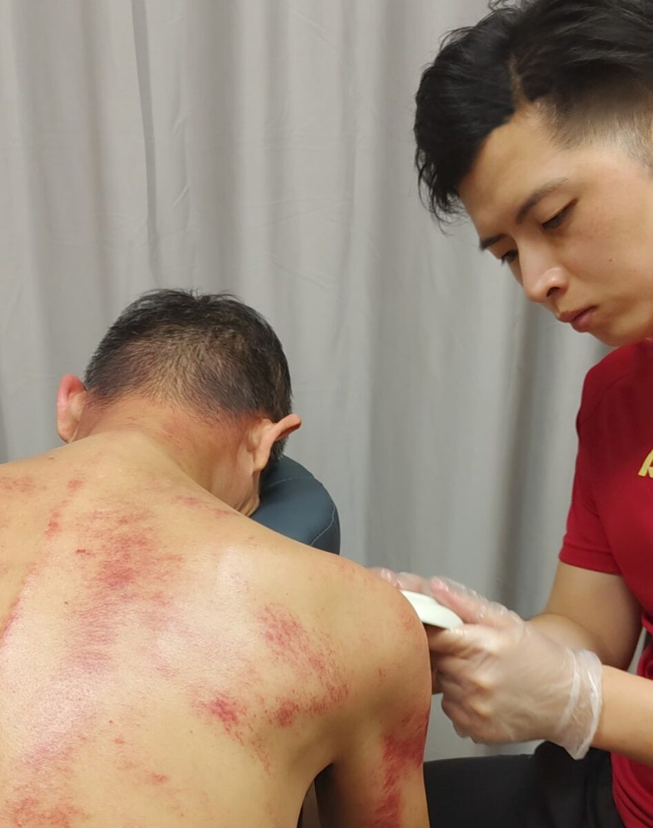 這位先生是辛苦的職業軍人,因為頭痛前來。曾花大錢嘗試頭療,卻毫無改善。詢問日常工作狀態,發現姿勢不良導致肌肉緊繃,最後變成頭痛。經過刮痧處理緊繃的肌肉後,頭痛感直接消失。