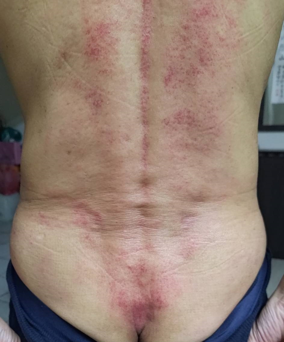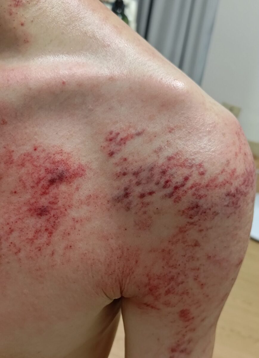 白天忙工地、晚上畫設計,久坐久站姿勢不良,導致膏肓痛難以入睡。這次在頸後與膏肓區塊痧色明顯